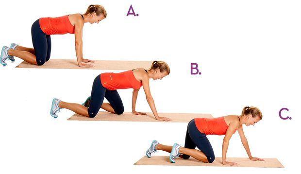 Ereszkedj négykézlábra úgy, hogy csuklóid a vállaid alatt legyenek, térdeid pedig a csípőd alatt (A). Emeld fel a jobb karod és a bal térded néhány centire a szőnyegtől és mozgasd őket 10-15 centire előre (B). Ez után ismételd meg mindezt a másik karoddal és lábaddal (C). Egy ismétlésnek számít az, amikor a bal kezed újra a szőnyegre érkezik, tehát 1-1 lépést végzel minkét oldalon. Összesen 3 sorozatot végezz belőle, 15-20 ismétléssel.