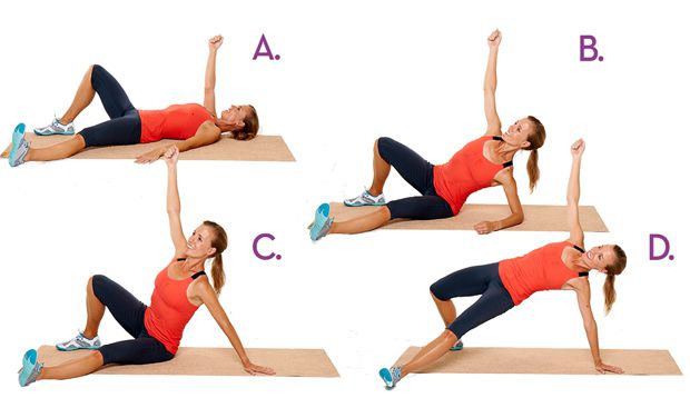 Feszítsd be központi izmaidat, emeld meg a vállaidat és kezdd el egy gördülő mozdulattal felemelni a törzsedet a szőnyegről, behajlítva eközben a bal könyöködet, az alkarodon megtámaszkodva (B). Nyújtsd magasabbra a jobb karodat és emeld tovább a törzsedet, közben pedig egyenesítsd ki minél jobban a bal karodat, hogy végül ne az alkarodon, hanem a tenyereden támaszkodj (C). Végezetül a bal karoddal és jobb talpaddal lefelé nyomva emeld ki teljesen a törzsedet a plafon irányába, és közben ügyelj rá, hogy a bal lábad egyenes maradjon (D). Tartsd meg 1-2 másodpercig, majd játszd le visszafelé a mozdulatsort és lassan térj vissza ez első pozícióba. Végezz mindkét oldalon 5-5 ismétlést.